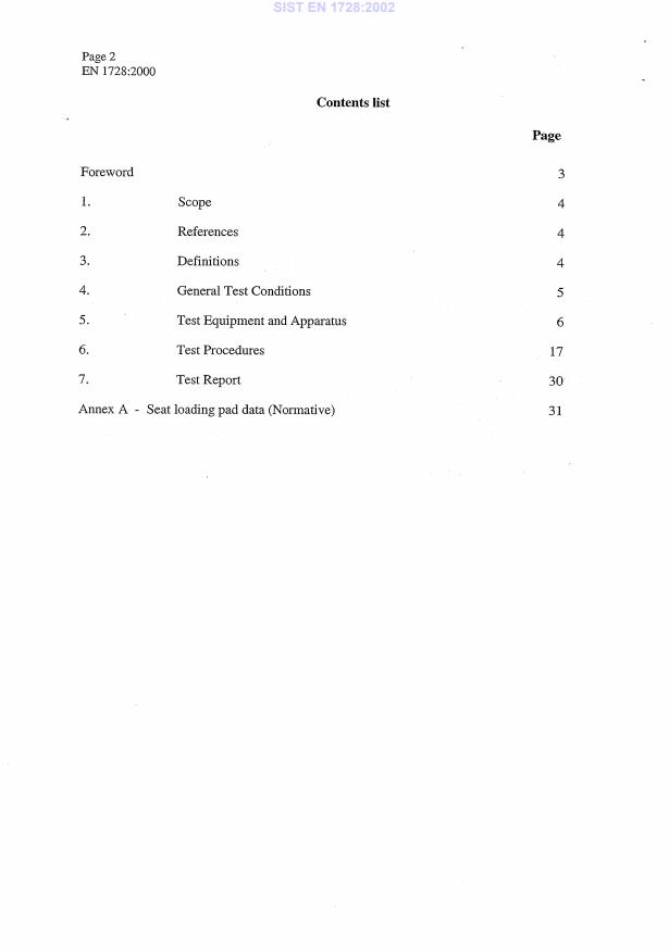 EN 1728:2000 is a standard published by the European Committee for Standardization (CEN). Its full title is "Domestic furniture - Seating - Test methods for the determination of strength and durability". This standard covers: This draft European Standard specifies test methods for determining the strength and durability of the structure of all types of domestic seating for adults without regard to materials, design/construction or manufacturing processes. Test methods for the assessment of ageing and degradation are not included.