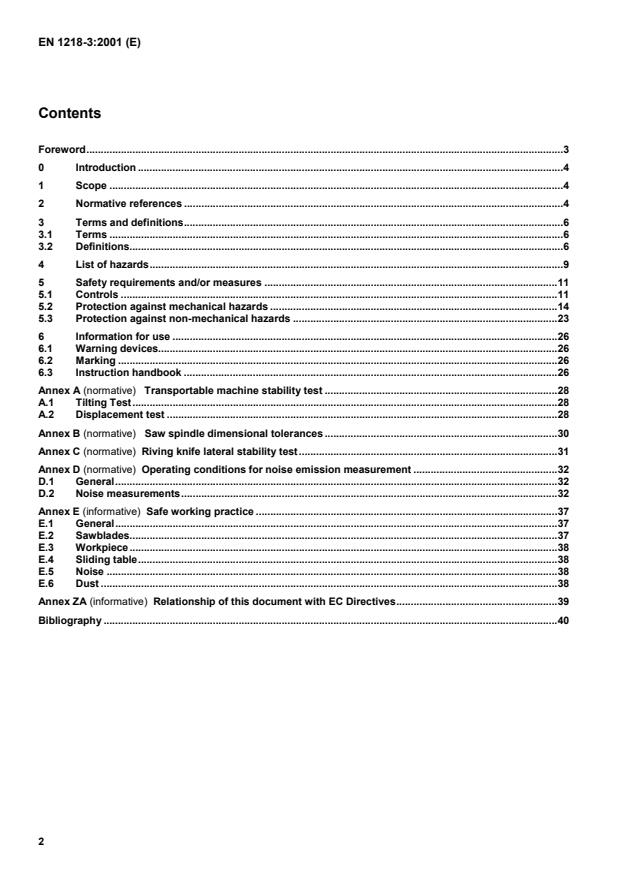 This European Standard sets out the requirements and/or the measures to remove the hazards and limit the risks on hand fed tenoning machines with sliding table for cutting structural timbers, hereinafter referred to as "machines". This European Standard does not apply to : ¾ machines where the tenon is produced by means of milling tools; ¾ machines designed for a tool spindle speed exceeding 6000 min-1; ¾ machines where the cuts are made on both ends of the workpiece during one cycle; ¾ combined machines used for tenoning (see EN 940 : 1997); ¾ the tenoning attachment on a vertical spindle moulding machine (see EN 848-1 : 1998). This European Standard covers the hazards relevant to this machine as listed in clause 4. For Computer Numerically Controlled (CNC) machines this European Standard does not cover hazards related to Electro-Magnetic Compatibility (EMC). This European Standard is primarily directed to machines which are manufactured after the date of issue of this European Standard.