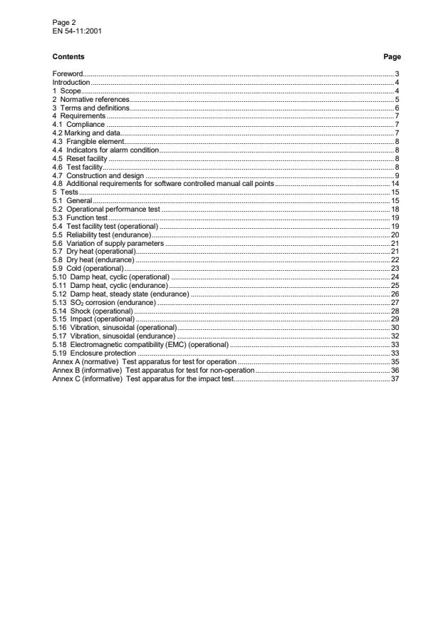EN 54-11:2001 is a standard published by the European Committee for Standardization (CEN). Its full title is "Fire detection and fire alarm systems - Part 11: Manual call points". This standard covers: This European Standard specifies the requirements and methods of test for manual call points in fire detection and fire alarm systems in and around buildings. It takes into account indoor and outdoor conditions, the appearance and operation of the manual call points for type A "direct operation" and type B "indirect operation" and covers those which are simple mechanical switches, those which are fitted with simple electronic components (e.g. resistors, diodes) and those which contain active electronic components and which work with the control panels for signalling and identifying, for example, an address or location. This European standard does not cover manual call points for special applications, for example manual call points that are intrinsically safe or for use in hazardous conditions, if such applications require additional or other requirements or tests than those given in this standard.