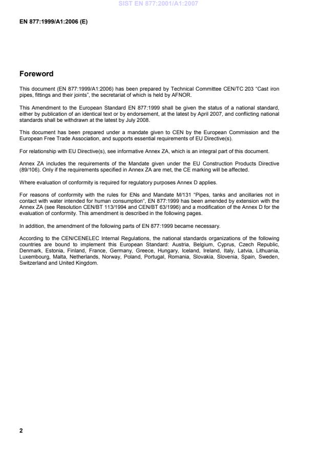 This amendment A1 modifies the European Standard EN 877:1999; it was approved by CEN on 24 August 2006.