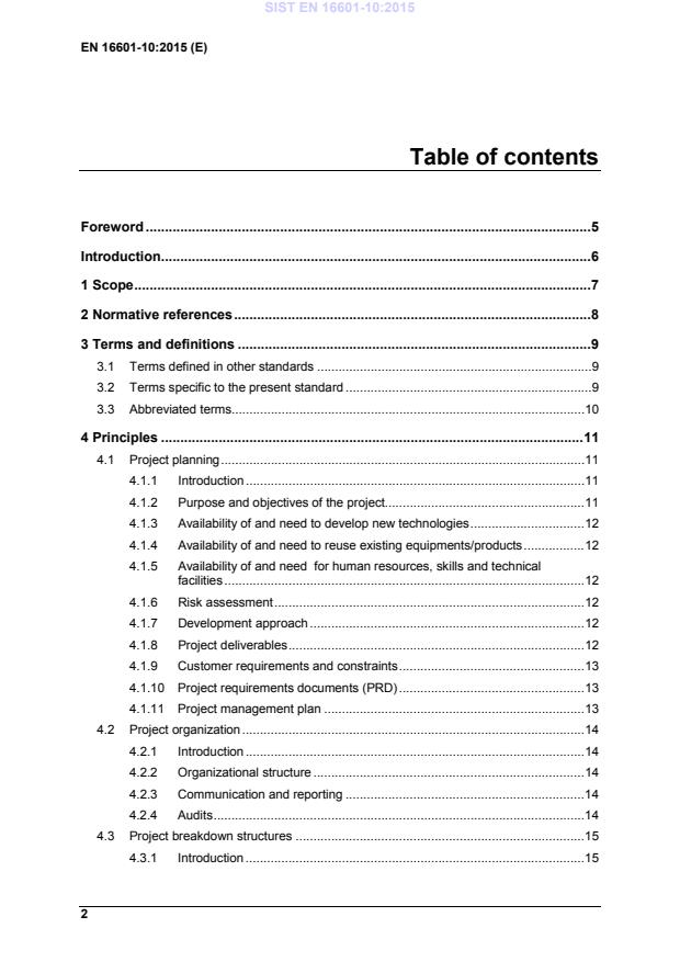 for human resources, skills and technical facilities . 12 4.1.6 Risk assessment . 12 4.1.7 Development approach . 12 4.1.8 Project deliverables . 12 4.1.9 Customer requirements and constraints . 13 4.1.10 Project requirements documents (PRD) . 13 4.1.11 Project management plan . 13 4.2 Project organization . 14 4.2.1 Introduction . 14 4.2.2 Organizational structure . 14 4.2.3 Communication and reporting . 14 4.2.4 Audits . 14 4.3 Project breakdown structures . 15 4.3.1 Introduction . 15 SIST EN 16601-10:2015