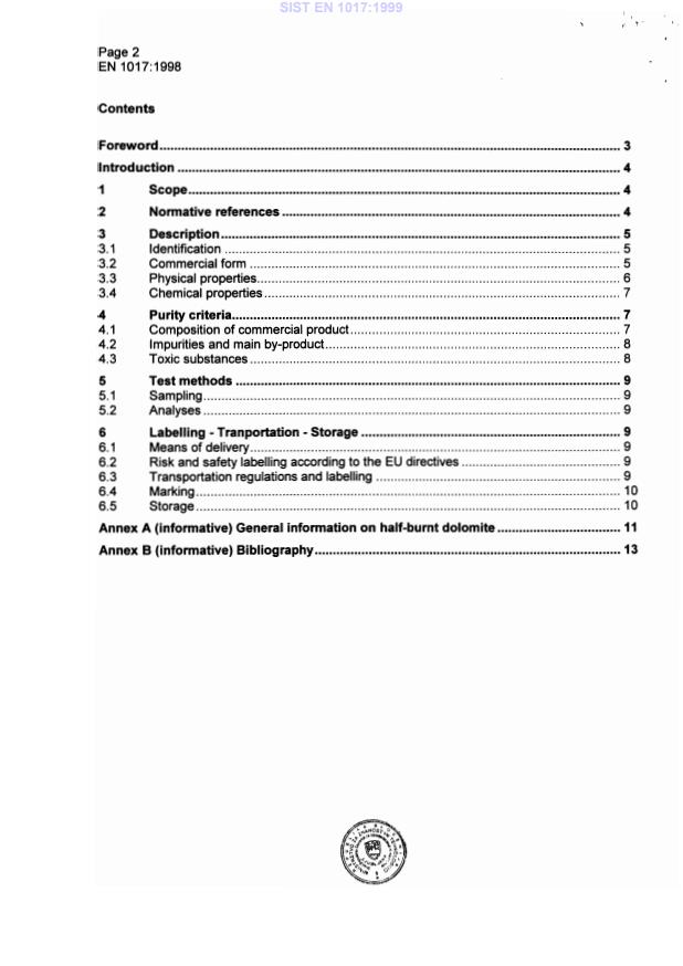 2003-01.Slovenski inštitut za standardizacijo. Razmnoževanje celote ali delov tega standarda ni dovoljeno.Kemikalije, ki se uporabljajo za pripravo pitne vode – Polpraženi dolomitProdukte zur Aufbereitung von Wasser für den menschlichen Gebrauch - Halbgebrannter DolomitProduits chimiques utilisés pour le traitement de l'eau destinée a la consommation humaine - Dolomie semi-calcinéeChemicals used for treatment of water intended for human consumption - Half-burnt dolomite71.100.