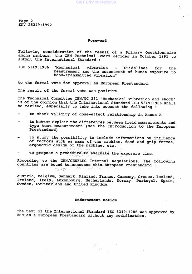 ENV 25349:1992 is a standardization document published by the European Committee for Standardization (CEN). Its full title is "Mechanical vibration - Guidelines for the measurement and the assessment of human exposure to hand-transmitted vibration (ISO 5349:1986)". This standard covers: This EN specifies general methods for measuring and reporting hand-transmitted vibration guidance for the evaluation of hand-transmitted vibration specified in terms of a frequency-weighted vibration acceleration and dayly exposure time. It does not define the limits of safe exposure.