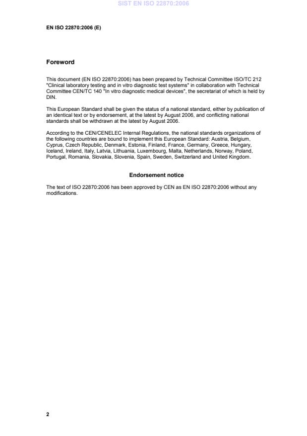 This document (EN ISO 22870:2006) has been prepared by Technical Committee ISO/TC 212 "Clinical laboratory testing and in vitro diagnostic test systems" in collaboration with Technical Committee CEN/TC 140 "In vitro diagnostic medical devices", the secretariat of which is held by DIN.