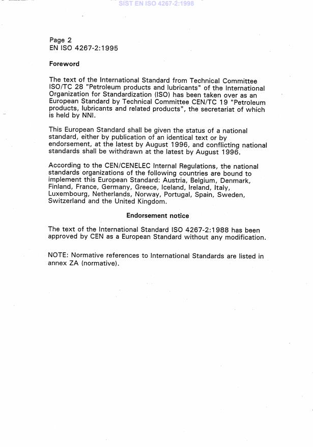 ISO 4267-2 : 1988 EI Foreword ISO (the International Organization for Standardization) is a worldwide federation of national Standards bodies (ISO member bedies). The work of preparing International Standards is normally carried out through ISO technical committees. Esch member body interested in a subject for which a technical committee has been established has the right to be represented on that committee. International organizations, govern- mental and non-governmental, in liaison with ISO, also take part in the work. ISO collaborates closely with the International Electrotechnical Commission (IEC) on all matters of electrotechnical standardization. Draft International Standards adopted by the technical committees are circulated to the member bodies for approval before their acceptance as International Standards by the ISO Council. They are approved in accordance with ISO procedures requiring at least 75 % approval by the member bodies voting. International Standard ISO 4267-2 was prepared by Technical Committee ISO/TC 28, Petroleum products and lubricants. Users should note that all International Standards undergo revision from time to time and that any reference made herein to any other International Standard implies its latest edition, unless otherwise stated. 0 International Organkation for Standardization, 1988 0 Printed in Switzerland ii SIST EN ISO 4267-2:1998