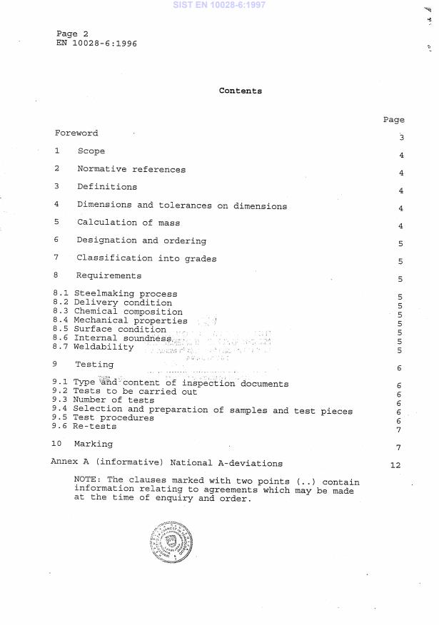 EN 10028-6:1996 is a standard published by the European Committee for Standardization (CEN). Its full title is "Flat products made of steels for pressure purposes - Part 6: Weldable fine grain steels, quenched and tempered". This standard covers: This part of EN 10028 specifies the requirements for flat products for pressure equipments made of liquid quenched and tempered steels as listed in table 1. Other parts of this European Standard are: EN 10028-1 Flat products made of steels for pressure purposes - General requirements EN 10028-2 Flat products made of steels for pressure purposes - Part 2 : Non-alloy and alloy steels with specified elevated temperature properties EN 10028-3 Flat products made of steels for pressure purposes - Part 3 : Weldable fine grain steels, normalized EN 10028-4 Flat products made of steels for pressure purposes - Part 4 : Nickel alloy steels with specified low temperature properties EN 10028-5 Flat products made of steels for pressure purposes - Part 5 : Weldable fine grain steels, thermomechanically rolled EN 10028-7 Flat products made of steels for pressure purposes - Part 7 : Stainless steels