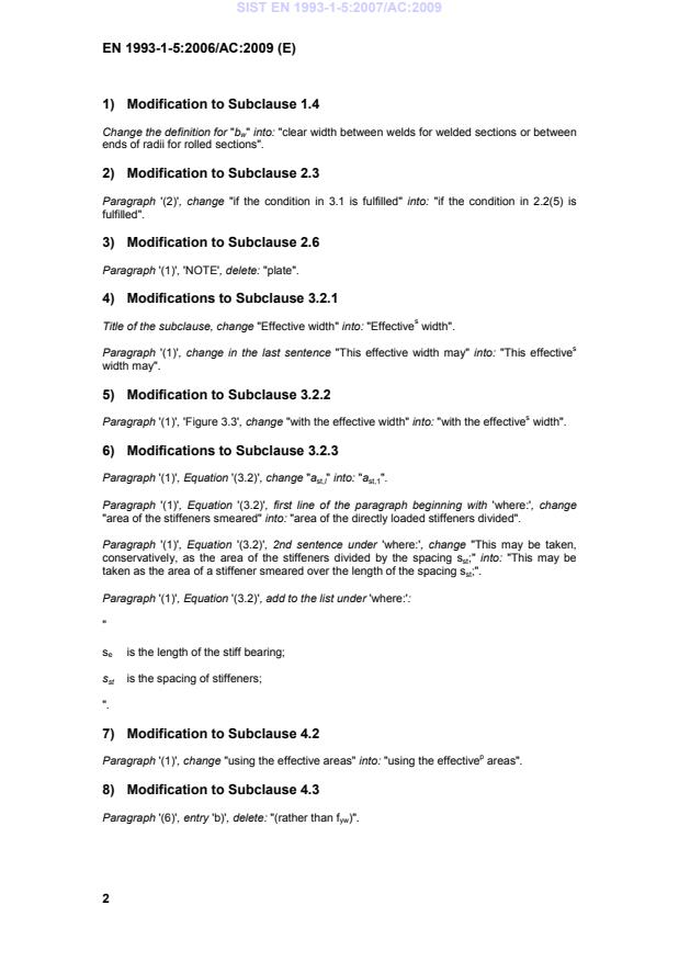 is the spacing of stiffeners; ". 7) Modification to Subclause 4.2 Paragraph '(1)', change "using the effective areas" into: "using the effectivep areas". 8) Modification to Subclause 4.3 Paragraph '(6)', entry 'b)', delete: "(rather than fyw)". SIST EN 1993-1-5:2007/AC:2009