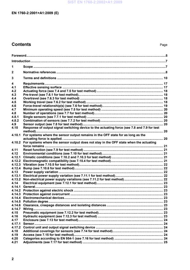 EN 1760-2:2001+A1:2009 is a standard published by the European Committee for Standardization (CEN). Its full title is "Safety of machinery - Pressure sensitive protective devices - Part 2: General principles for the design and testing of pressure sensitive edges and pressure sensitive bars". This standard covers: This standard contains requirements for pressure sensitive edges and pressure sensitive bars for use as safety devices and not as actuating devices for normal operational. The standard applies to pressure sensitive edges and pressure sensitive bars used to detect persons or parts of persons who may be exposed to danger such as hazardous moving parts. The purpose of this standard relates primarily to safety and reliability rather than suitability. For the relationship between safety and reliability, see annex D of EN 954-1:1996. This standard specifies requirements for pressure sensitive edges and pressure sensitive bars with and without an external reset facility. This standard is restricted to the functioning of pressure sensitive edges and pressure sensitive bars and does not specify the requirements for their application. However, clause 6 contains requirements for information for use which has to be provided by the manufacturer. A selection procedure is given in annex C. The design notes in annex D give additional guidance regarding the design of pressure sensitive edges and pressure sensitive bars which will give safe and reliable service. The notes in annex E provide general guidance regarding application, while annex G provides guidance on the application of sensors, especially for air-pulse systems. This standard does not specify the dimensions of the pressure sensitive edges or bars in relation to a particular application. The standard does not apply to stopping devices according to EN 60204-1 used only for normal operational, including emergency stopping, of machinery. Additional requirements may be necessary where pressure sensitive edges and pressure sensitive bars are used in locations accessible to elderly or disabled people or children. NOTE It may not be possible to carry out all the tests in this standard for pressure sensitive edges and pressure sensitive bars when they have been designed and built into the machinery by its manufacturer.