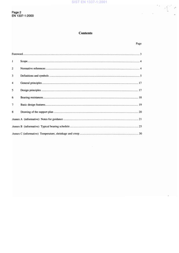 이 기사는 구조용 베어링에 적용되는 유럽표준인 EN 1337-1:2000에 대해 언급하고 있다. 이 유럽표준은 다리 및 다른 구조물에서 사용되는 구조용 베어링에 적용된다. 그러나 이 유럽표준은 다음을 포함하지 않는다: a) 주요 기능으로 모멘트를 전달하는 베어링, b) 끌어올림에 저항하는 베어링, c) 이동식 다리용 베어링, d) 콘크리트 힌지, e) 지진 기기. 임시 베어링을 규제하는 것은 목적이 아니지만, 건설이나 수리 및 유지보수 중인 구조물에 사용되는 경우 가이드로 활용될 수 있다. 이 유럽표준은 주로 영구적인 구조용 베어링을 위해 개발되었다.