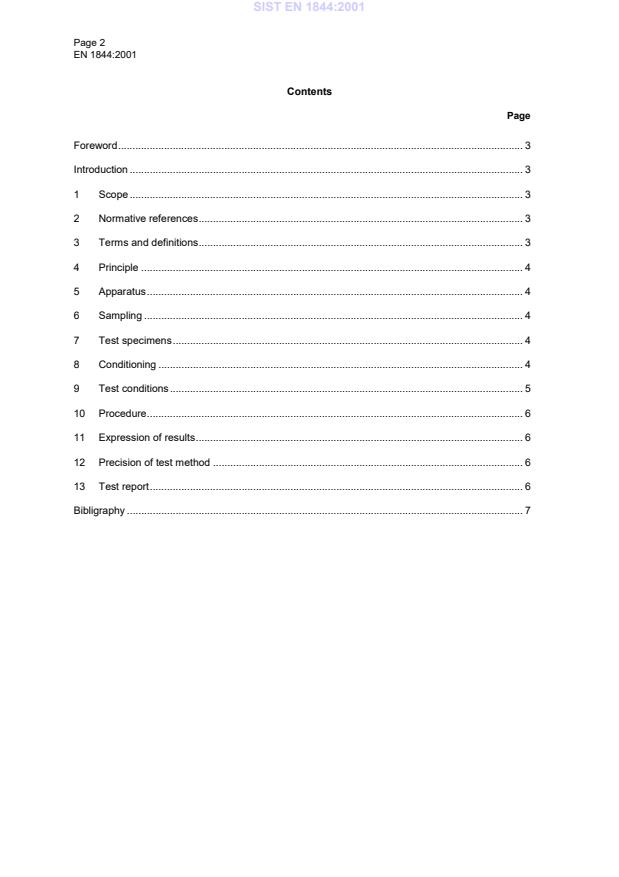 Page 2EN 1844:2001ContentsPageForeword.3Introduction.31Scope.32Normative references.33Terms and definitions.34Principle.45Apparatus.46Sampling.47Test specimens.48Conditioning.49Test conditions.510Procedure.611Expression of results.612Precision of test method.613Test report.6Bibligraphy.7SIST EN 1844:2001