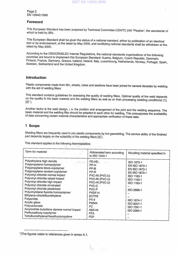 Keywords: EN 12943:1999, filler materials for thermoplastics, thermoplastic welding consumables, welding fillers, hot gas welding, designation, requirements, tests, CEN standard.