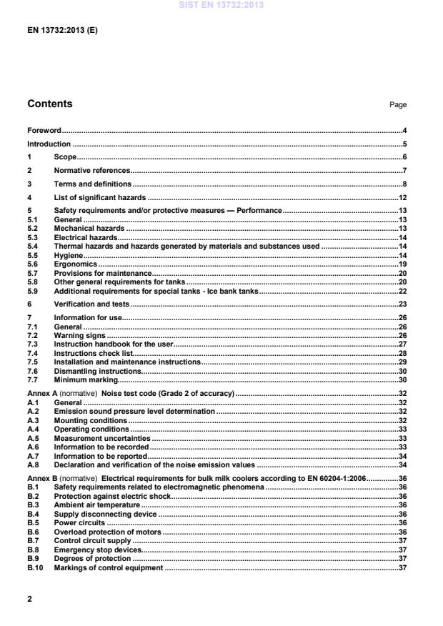 Page Foreword . 4 Introduction . 5 1 Scope . 6 2 Normative references . 7 3 Terms and definitions . 8 4 List of significant hazards . 12 5 Safety requirements and/or protective measures — Performance . 13 5.1 General . 13 5.2 Mechanical hazards . 13 5.3 Electrical hazards . 14 5.4 Thermal hazards and hazards generated by materials and substances used . 14 5.5 Hygiene . 14 5.6 Ergonomics . 19 5.7 Provisions for maintenance . 20 5.8 Other general requirements for tanks . 20 5.9 Additional requirements for special tanks - Ice bank tanks . 22 6 Verification and tests . 23 7 Information for use . 26 7.1 General . 26 7.2 Warning signs . 26 7.3 Instruction handbook for the user . 27 7.4 Instructions check list . 28 7.5 Installation and maintenance instructions . 29 7.6 Dismantling instructions. 30 7.7 Minimum marking. 30 Annex A (normative)