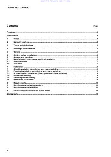CEN/TS 15717:2008 is a technical specification published by the European Committee for Standardization (CEN). Its full title is "Parquet flooring - General guideline for installation". This standard covers: This Technical specification gives guidelines for installation of parquet flooring. Products which are defined in EN 13226, EN 13227, EN 13228, EN 13488, EN 13489, EN 13629, and EN 14761 are concerned. This Technical specification applies for installations indoors, and does not apply to the installation of joists and sub floors. This Technical specification does not cover installations in service class 3 (see 3.4).