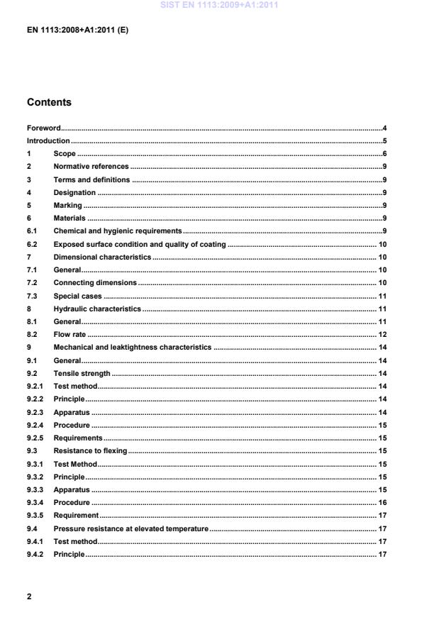 Foreword This document (EN 1113:2008+A1:2011) has been prepared by Technical Committee CEN/TC 164 “Water supply”, the secretariat of which is held by AFNOR. This European Standard shall be given the status of a national standard, either by publication of an identical text or by endorsement, at the latest by August 2011, and conflicting national standards shall be withdrawn at the latest by August 2011. Attention is drawn to the possibility that some of the elements of this document may be the subject of patent rights. CEN [and/or CENELEC] shall not be held responsible for identifying any or all such patent rights. This document includes Amendment 1, approved by CEN on 2011-01-09. This document supersedes !EN 1113:2008". The start and finish of text introduced or altered by amendment is indicated in the text by tags ! ". The scope is enlarged to include requirements for shower hoses used with water systems of type 1 and type 2. See Tables 1, 2, 3 and 4. According to the CEN/CENELEC Internal Regulations, the national standards organizations of the following countries are bound to implement this European Standard: Austria, Belgium, Bulgaria, Croatia, Cyprus, Czech Republic, Denmark, Estonia, Finland, France, Germany, Greece, Hungary, Iceland, Ireland, Italy, Latvia, Lithuania, Luxembourg, Malta, Netherlands, Norway, Poland, Portugal, Romania, Slovakia, Slovenia, Spain, Sweden, Switzerland and United Kingdom. SIST EN 1113:2009+A1:2011