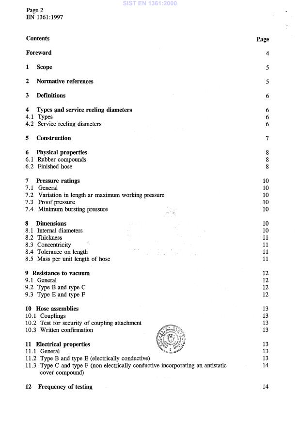 EN 1361:1997 is a standard published by the European Committee for Standardization (CEN). Its full title is "Rubber hoses and hose assemblies for aviation fuel handling - Specification". This standard covers: This European Standard specifies the dimensions, construction and requirements for four types of hoses and hose assemblies for use in all operations associatedwith the ground fuelling and defuelling of aircraft. All four types of hose are designed for: a) use with petroleum fuels, having an aromatic hydrocarbon content not exceeding 30 % by volume; b) operation within the temperature range of - 30°C to + 65 °C and are to be undamaged by climatic conditions of - 40 °C to + 70 °C when stored in static conditions.