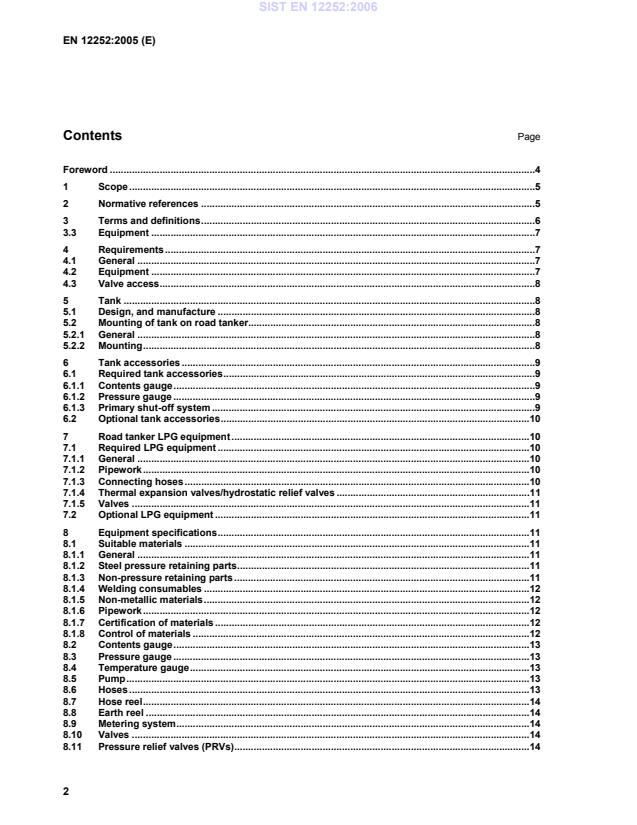 EN 12252:2005 is a standard published by the European Committee for Standardization (CEN). Its full title is "LPG equipment and accessories - Equipping of LPG road tankers". This standard covers: This European Standard specifies equipment and accessories for road tankers used for the transport of Liquefied Petroleum Gas (LPG) and identifies the equipment that is considered necessary to ensure that filling, transportation and discharge operations can be carried out safely. It also specifies the requirements for the assembly of the accessories and the vehicle LPG equipment to the road tanker. This European Standard also identifies additional equipment and accessories that may be used on road tankers carrying LPG. NOTE This European Standard does not preclude the use of alternative designs, materials and equipment testing which provide a similar level of safety. This European Standard does not apply to "tank-containers" and "battery-vehicles" used for the transportation of LPG.
