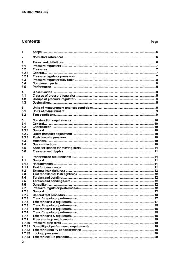 EN 88-1:2007 is a standard published by the European Committee for Standardization (CEN). Its full title is "Pressure regulators and associated safety devices for gas appliances - Part 1: Pressure regulators for inlet pressures up to and including 500 mbar". This standard covers: This European Standard specifies the safety, construction and performance requirements for pressure regulators, (hereafter referred to as regulators), intended for use with gas burners and gas burning appliances using fuel gases of the 1st, 2nd and 3rd families. This European Standard covers type testing only. It also gives information necessary for the purchaser and user. This European Standard is applicable to regulators, which may be tested independently of these appliances, having a connection size up to and including DN 250 and a declared maximum working pressure up to and including 500 mbar. The methods of test given in this European Standard are intended for product type testing only. Tests intended for production testing are not specifically included. Regulators intended to be used on installations for the 3rd family gases are also covered by EN 13785 and EN 13786. This European Standard does not cover: a) pressure regulators connected directly to mains pipework or to a container that maintains a standard distribution pressure; b) pressure regulators intended for gas appliances to be installed out-of-doors and exposed to the environment; c) pressure regulators which use electrical auxiliary energy.