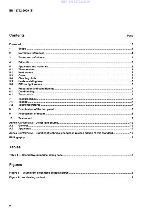 1 Scope This European Standard specifies a method for the assessment of the resistance to dry heat of all rigid furniture surfaces regardless of materials. It does not apply to leather and textile surfaces. The test is intended to be carried out on a part of the finished furniture, but can be carried out on test panels of the same material, finished in an identical manner to the finished product, and of a size sufficient to meet the requirements of the test. The test should be carried out on unused surfaces. Annex A (informative) describes a direct light source. 2 Normative references The following referenced documents are indispensable for the application of this document. For dated references, only the edition cited applies. For undated references, the latest edition of the referenced document (including any amendments) applies. EN ISO 4287:1998, Geometrical Product Specifications (GPS) – Surface texture: Profile method – Terms, definitions and surface texture parameters (ISO 4287:1997) EN ISO 4288:1997, Geometrical Product Specifications (GPS) – Surface texture: Profile method – Rules and procedures for the assessment of surface texture (ISO 4288:1996) ISO 209:2007, Aluminium and aluminium alloys – Chemical composition ISO 1770:1981, Solid-stem general purpose thermometers 3 Terms and definitions For the purposes