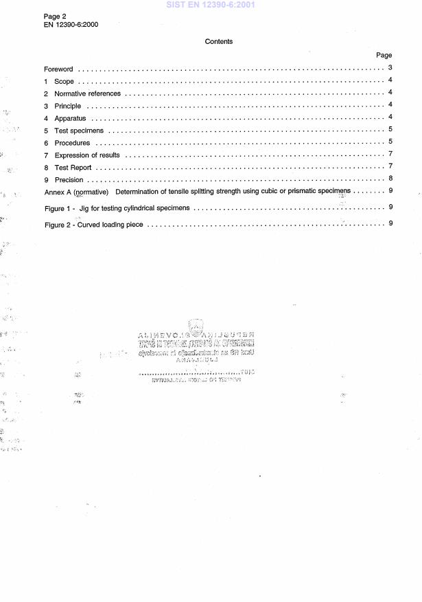 EN 12390-6:2000 is a standard published by the European Committee for Standardization (CEN). Its full title is "Testing hardened concrete - Part 6: Tensile splitting strength of test specimens". This standard covers: This standard specifies a method for the determination of the tensile splitting strength of cylindrical test specimens of hardened concrete. A method using cubic or prismatic specimens is included in annex A (normative).