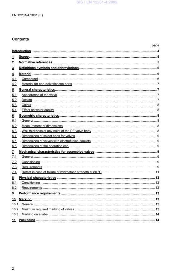 It should be noted that, while awaiting the adoption of verifiable European criteria, existing national regulationsconcerning the use and/or the characteristics of this product remain in force.Requirements and test methods for material and components, other than valves, are specified in prEN 12201-1,prEN 12201-2 and prEN 12201-3. Characteristics for fitness of purpose are covered in prEN 12201-5 andprEN 12201-7 gives guidance for the assessment of conformity.This Part of prEN 12201 covers the characteristics of valves.SIST EN 12201-4:2002