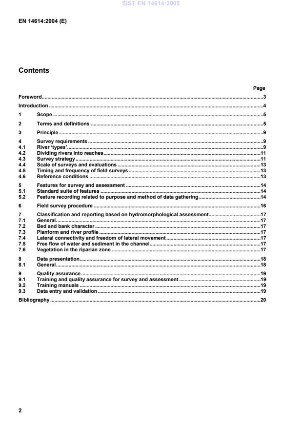EN 14614:2004 is a standard published by the European Committee for Standardization (CEN). Its full title is "Water Quality - Guidance standard for assessing the hydromorphological features of rivers". This standard covers: This document provides guidance on the features to be recorded when characterising and assessing the hydromorphology of rivers. It is based on methods developed, tested, and compared in Europe. Its main aim is to improve the comparability of hydromorphological survey methods, data processing, interpretation and presentation of results. Whilst it has particular importance in relation to the reporting requirements of the WFD, it also has considerably wider scope for other applications. Although hydromorphology is dependent on hydrology and underlying geology, this standard is focused on the structural features of rivers and on river continuity. In addition, whilst recognising the important influence of hydromorphology on plant and animal ecology and, conversely, the influence of plants and animals on hydromorphology, no attempt is made to provide guidance in this area.