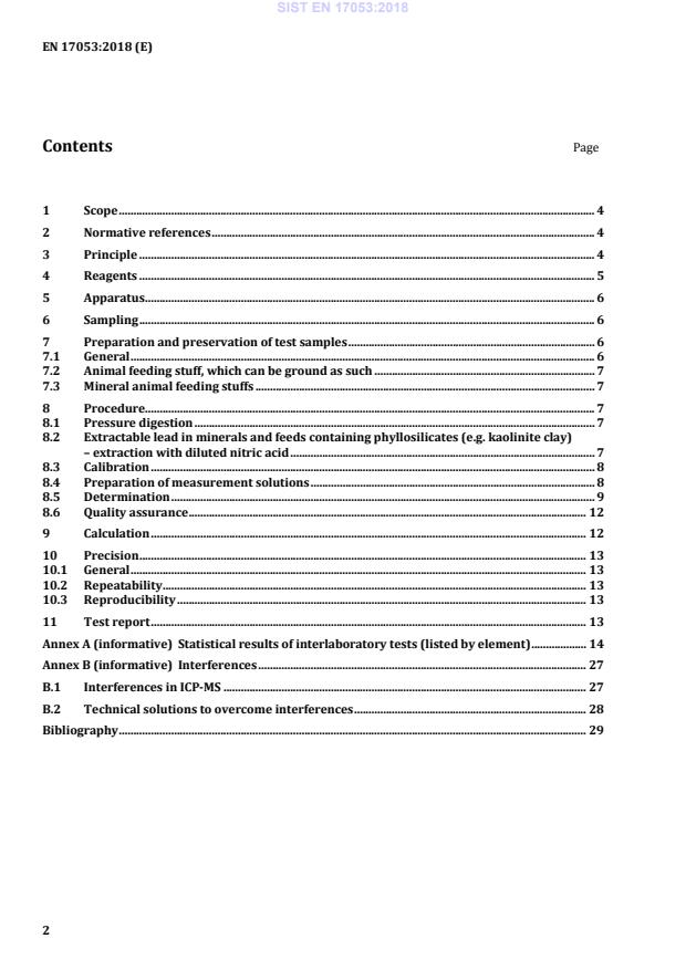 Ta evropski standard določa metodo za določanje elementov v sledovih, težkih kovin in drugih elementov v živalski krmi po ICP-MS. Metoda se uporablja za določanje As, Cd, Co, Cu, Fe, Hg, Mn, Mo, Pb, Se, Tl, U in Zn v raztopini za izločanje po razgradnji pod tlakom. Za določevanje izločljivega svinca v mineralih in krmah, ki vsebujejo filosilikate (npr. kaolinitna glina), je treba uporabiti postopek mokrega razklopa z dušikovo kislino. Opisana metoda je primerna za uporabo pri kvadrupolnih instrumentih, opremljenih z dodatno tehnologijo za zmanjševanje motenj molekularnih ionov (npr. tehnologije trkov ali reakcij) ali brez te tehnologije, ter pri visokoločljivostnih sistemih sektorskih polj.