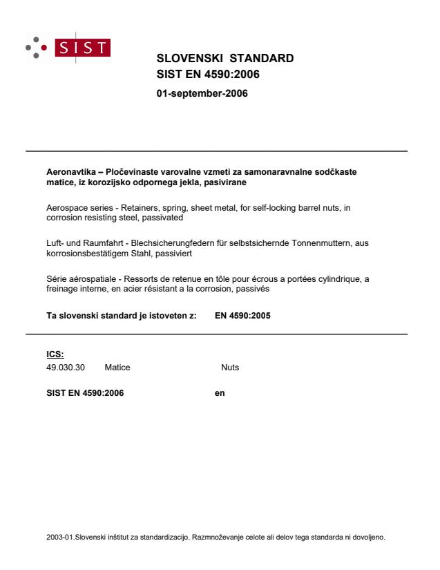 2003-01.Slovenski inštitut za standardizacijo. Razmnoževanje celote ali delov tega standarda ni dovoljeno.þNDVWHLuft- und Raumfahrt - Blechsicherungfedern für selbstsichernde Tonnenmuttern, aus korrosionsbestätigem Stahl, passiviertSérie aérospatiale - Ressorts de retenue en tôle pour écrous a portées cylindrique, a freinage interne, en acier résistant a la corrosion, passivésAerospace series - Retainers, spring, sheet metal, for self-locking barrel nuts, in corrosion resisting steel, passivated49.030.30MaticeNutsICS:Ta slovenski standard je istoveten z:EN 4590:2005SIST EN 4590:2006en01-september-2006SIST EN 4590:2006SLOVENSKI