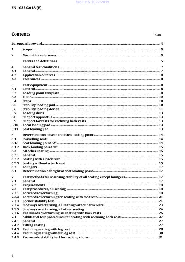 Page European foreword . 4 1 Scope . 5 2 Normative references . 5 3 Terms and definitions . 5 4 General test conditions . 7 4.1 General . 7 4.2 Application of forces . 8 4.3 Tolerances . 8 5 Test equipment . 8 5.1 General . 8 5.2 Loading point template . 8 5.3 Floor . 10 5.4 Stops . 10 5.5 Stability loading pad . 10 5.6 Stability loading device . 11 5.7 Loading discs. 13 5.8 Support apparatus . 13 5.9 Support for tests for reclining back rests . 13 5.10 Local loading pad . 13 5.11 Seat loading pad . 13 6 Determination of seat and back loading points . 14 6.1 Swivelling seats . 14 6.1.1 Seat loading point “A” . 14 6.1.2 Back loading point “B” . 15 6.2 All other seating . 15 6.2.1 General . 15 6.2.2 Seating with a back rest . 15 6.2.3 Seating without a back rest . 15 6.3 Loungers . 17 6.4 Determination of height of seat loading point . 17 7 Test methods for assessing stability of all seating except loungers . 17 7.1 General . 17 7.2 Requirements . 18 7.3 Test procedures, all seating . 18 7.3.1 Forwards overturning . 18 7.3.2 Forwards overturning for seating with foot rest . 21 7.3.3 Corner stability test . 21 7.3.4 Sideways overturning, all seating without arm rests . 23 7.3.5 Sideways overturning, all other seating . 24 7.3.6 Rearwards overturning all seating with back rests . 26 7.4 Additional test procedures for seating with reclining back rests . 27 7.4.1 General . 27 7.4.2 Tilting seating . 27 7.4.3 Reclining seating with leg rest . 28 7.4.4 Reclining seating without leg rest . 30 7.4.5 Rearwards stability test for rocking chairs . 31 SIST EN 1022:2019