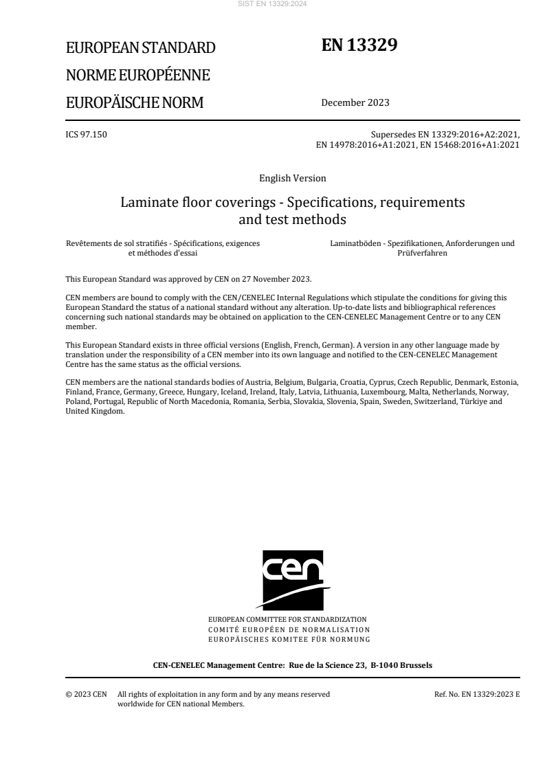 EN 13329:2023 is a standard published by the European Committee for Standardization (CEN). Its full title is "Laminate floor coverings - Specifications, requirements and test methods". This standard covers: This document specifies characteristics, requirements and test methods for laminate floor coverings with a surface layer as defined in 3.2 to 3.5. It also specifies requirements for marking and packaging. It includes a classification system, based on EN ISO 10874, giving practical requirements for areas of use and levels of use, to indicate where laminate floor coverings will give satisfactory service and to encourage the consumer to make an informed choice. Laminate floor coverings are generally designed for floating installations and are considered for domestic and commercial levels of use, including domestic kitchens. This document does not specify requirements relating to the use in areas which are subjected to frequent wetting, such as bathrooms, laundry rooms or saunas. In general, laminate floor coverings can only be used in those areas when authorized by the manufacturer and under conditions described in the manufacturer's installation guidelines.