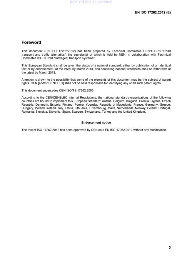 EN ISO 17262:2012 is classified under the following ICS (International Classification for Standards) categories: 03.220.20 - Road transport; 35.240.60 - IT applications in transport. The ICS classification helps identify the subject area and facilitates finding related standards.