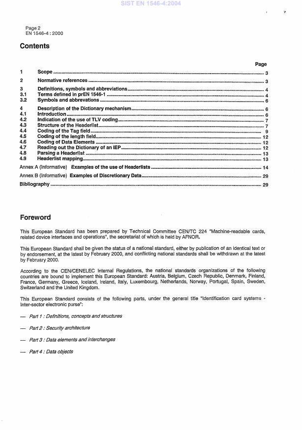 EN 1546-4:1999 is a standard published by the European Committee for Standardization (CEN). Its full title is "Identification card systems - Inter-sector electronic purse - Part 4: Data objects". This standard covers: This part of EN 1546 defines the Tag values required and describes the Dictionary mechanisms necessary for their utilisation in order to achieve interoperability between IEP Systems where Data Elements have different lengths and/or the ordering of Data Elements in commands and responses is different from that defined in EN 1546-3. The mechanisms are based on TLV (Tag-length-value) definitions of each Data Element.