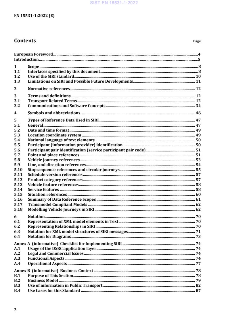 EN 15531-1:2022 is a standard published by the European Committee for Standardization (CEN). Its full title is "Public transport - Service interface for real-time information relating to public transport operations - Part 1: Context and framework". This standard covers: 1.1 Interfaces specified by this document 1.1.1 Business Context Real-time information may be exchanged between a number of different organisations, or between different systems belonging to the same organisation. Key interfaces include the following: - Between public transport vehicle control centres - generally, for fleet and network management. - Between a control centre and an information provision system - generally, to provide operational information for presentation to the public. - Between information provision systems - generally, sharing information to ensure that publicly available information is complete and comprehensive. - Between information provision systems - and data aggregation systems that collect and integrate data from many different sources and different types of data supplier and then distribute it onwards. - Between information provision systems and passenger information devices such as mobile phones, web browsers, etc. Annex B describes the business context for SIRI in more detail. SIRI is intended for wide scale, distributed deployment by a wide variety of installations. In such circumstances it is often not practical to upgrade all the systems at the same time. SIRI therefore includes a formal versioning system that allows for the concurrent operation of different levels at the same time and a disciplined upgrade process. In this general framework, SIRI defines a specific set of concrete functional services. The services separate the communication protocols from the message content (‘functional services’). This allows the same functional content to be exchanged using different transport mechanisms, and different patterns of exchange. Figure 1 below shows this diagrammatically. 1.1.2 SIRI Communications SIRI provides a coherent set of functional services for exchanging data for different aspects of PT operation. A common data model, based on Transmodel 6.0, is used across all services. ...