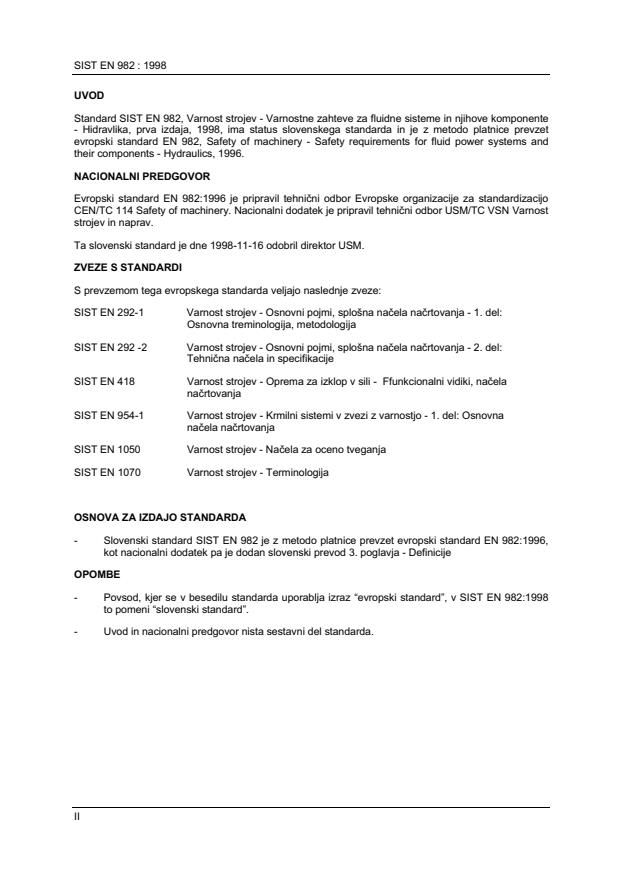 EN 982:1996 is a standard + national annex and/or foreword published by the European Committee for Standardization (CEN). Its full title is "Safety of machinery - Safety requirements for fluid power systems and their components - Hydraulics". This standard covers: This standard applies to hydraulic systems and their components on machinery. It identifies hazards and factors which affect the safety of systems and their components when they are put to their intended use. The principles specified apply to the design, construction and modification of new systems and their components and aspects of use including: - assembly; - installation; - adjustment; - operation; - cleaning; - maintenance; Components are covered in the standard but only to the extent that safety requirements are given to allow the components to be safely integrated into a system's design.