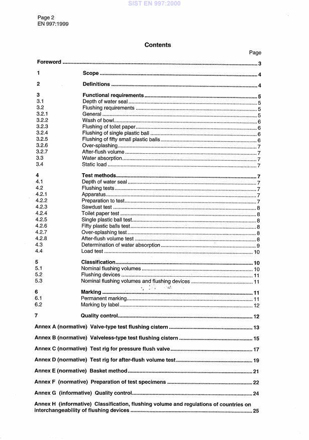 EN 997:1999 is a standard published by the European Committee for Standardization (CEN). Its full title is "WC pans with integral trap". This standard covers: Please read the qualifying note at the end of the summary of the directive. This standard specifies constructional and performance requirements together with test methods for WC pans with integral trap used for domestic purposes made from vitreous china or stainless steel which are flushed by a nominal volume of 6 l, 7 l or 9 l. This standard is not applicable to WC pans flushed with other volumes, squatting WC's and WC pans without integral trap.