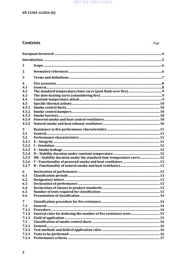 Page European foreword .4 Introduction .5 1 Scope .6 2 Normative references .6 3 Terms and definitions .7 4 Fire scenarios .8 4.1 General .8 4.2 The standard temperature/time curve (post flash-over fire) .9 4.3 The slow heating curve (smouldering fire) .9 4.4 Constant temperature attack .9 4.5 Specific thermal actions . 10 4.5.1 Smoke control ducts . 10 4.5.2 Smoke control dampers . 10 4.5.3 Smoke barriers . 10 4.5.4 Powered smoke and heat control ventilators . 10 4.5.5 Natural smoke and heat exhaust ventilators . 10 5 Resistance to fire performance characteristics . 11 5.1 General . 11 5.2 Performance characteristics . 11 5.2.1 E – Integrity . 11 5.2.2 I – Insulation . 12 5.2.3 S – Smoke leakage . 12 5.2.4 D – Stability duration under constant temperature . 12 5.2.5 DH – Stability duration under the standard time-temperature curve . 12 5.2.6 F – Functionality of powered smoke and heat ventilators . 13 5.2.7 B – Functionality of natural smoke and heat ventilators . 13 6 Declaration of performance . 13 6.1 Classification periods . 13 6.2 Designatory letters . 13 6.3 Declaration of performance . 13 6.4 Declaration of classes in product standards . 13 6.5 Number of tests required for classification . 13 6.6 Presentation of classification . 14 7 Classification procedure for fire resistance . 14 7.1 General . 14 7.1.1 Procedure . 14 7.1.2 General rules for deducing the number of fire resistance tests . 15 7.1.3 Field of application . 15 7.2 Classification of smoke control ducts . 16 7.2.1 General . 16 7.2.2 Test methods and field of application rules . 16 7.2.3 Tests to be performed . 16 7.2.4 Performance criteria . 17 SIST EN 13501-4:2016
