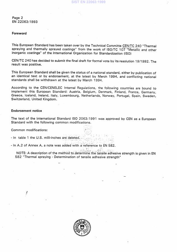 EN 22063:1993 is a standard published by the European Committee for Standardization (CEN). Its full title is "Metallic and other inorganic coatings - Thermal spraying - Zinc, aluminium and their alloys (ISO 2063:1991 modified)". This standard covers: Migrated from Progress Sheet (TC Comment) (2000-07-10): FV decided by TC resol 19/1992