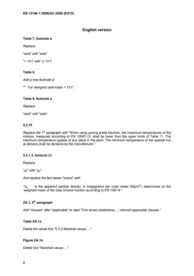EN 13108-1:2006/AC:2008 is a corrigendum published by the European Committee for Standardization (CEN). Its full title is "Bituminous mixtures - Material specifications - Part 1: Asphalt Concrete". This standard covers: 20070228 - Pending TC response - Problems with corr. content TC - Technical corrections in 5.2.10, Tables 7 and 8, Figures ZA.1a und ZA.1b, Tables ZA.1a, ZA.2 and ZA.3a and additional editorial improvements