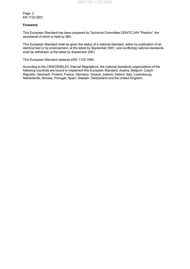 2EN 1122:2001ForewordThis European Standard has been prepared by Technical Committee CEN/TC 249 "Plastics", thesecretariat of which is held by IBN.This European Standard shall be given the status of a national standard, either by publication of anidentical text or by endorsement, at the latest by September 2001, and conflicting national standardsshall be withdrawn at the latest by September 2001.This European Standard replaces ENV 1122:1995.According to the CEN/CENELEC Internal Regulations, the national standards organizations of thefollowing countries are bound to implement this European Standard: Austria, Belgium, CzechRepublic, Denmark, Finland, France, Germany, Greece, Iceland, Ireland, Italy, Luxembourg,Netherlands, Norway, Portugal, Spain, Sweden, Switzerland and the United Kingdom.SIST EN 1122:2002