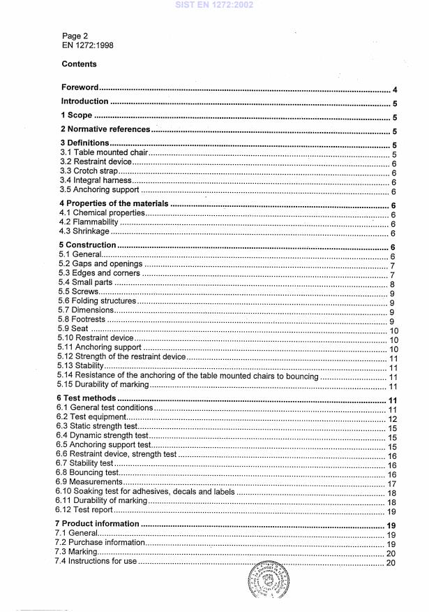 2003-01.Slovenski inštitut za standardizacijo. Razmnoževanje celote ali delov tega standarda ni dovoljeno.Izdelki za otroke – Stoli, ki se pritrdijo na mizo – Varnostne zahteve in preskusne metodeArtikel für Säuglinge und Kleinkinder - Tischhängesitze - Sicherheitstechnische Anforderungen und PrüfverfahrenArticles de puériculture - Sieges de table - Exigences de sécurité et méthodes d'essaiChild care articles - Table mounted chairs - Safety requirements and test methods97.190Otroška opremaEquipment for childrenICS:Ta slovenski standard je istoveten z:EN 1272:1998SIST EN 1272:2002en0