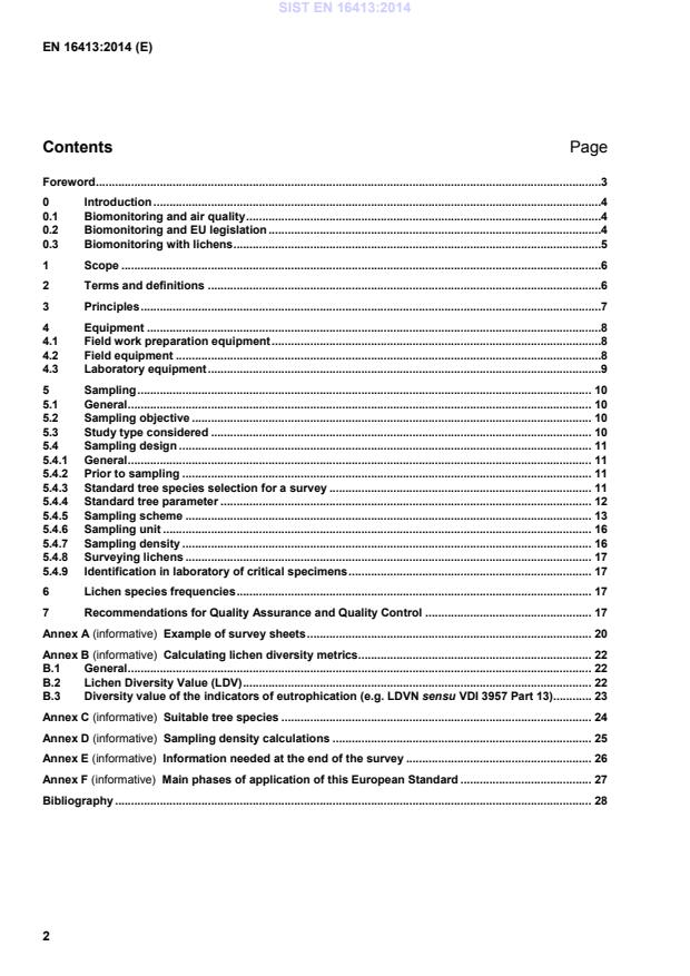 Page Foreword .3 0 Introduction .4 0.1 Biomonitoring and air quality .4 0.2 Biomonitoring and EU legislation .4 0.3 Biomonitoring with lichens .5 1 Scope .6 2 Terms and definitions .6 3 Principles .7 4 Equipment .8 4.1 Field work preparation equipment .8 4.2 Field equipment .8 4.3 Laboratory equipment .9 5 Sampling . 10 5.1 General . 10 5.2 Sampling objective . 10 5.3 Study type considered . 10 5.4 Sampling design . 11 5.4.1 General . 11 5.4.2 Prior to sampling . 11 5.4.3 Standard tree species selection for a survey . 11 5.4.4 Standard tree parameter . 12 5.4.5 Sampling scheme . 13 5.4.6 Sampling unit . 16 5.4.7 Sampling density . 16 5.4.8 Surveying lichens . 17 5.4.9 Identification in laboratory of critical specimens . 17 6 Lichen species frequencies . 17 7 Recommendations for Quality Assurance and Quality Control . 17 Annex A (informative)