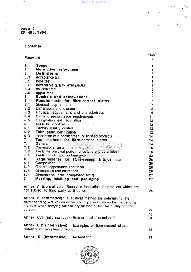 EN 492:1994 is a standard published by the European Committee for Standardization (CEN). Its full title is "Fibre-cement slates and their fittings for roofing - Product specification and test methods". This standard covers: This standard specifies the technical requirements and establishes methods of inspection and test as well as acceptance conditions for fibre-cement fittings for roofing. It applies to fibre-cement slates with a height dimension not exceeding 850mm for overlapping assembly into coverings for roofs. For the purpose of this standard fibre-cement slates have been classified according to their bending moment. It identifies the water tightness.