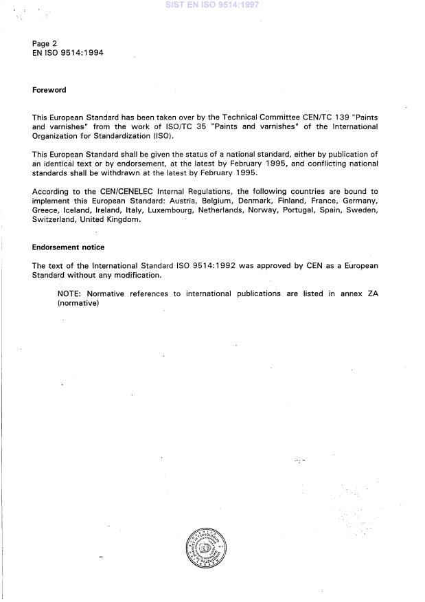 EN ISO 9514:1994 is a standard published by the European Committee for Standardization (CEN). Its full title is "Paints and varnishes - Determination of the pot-life of liquid systems - Preparation and conditioning of samples and guidelines for testing (ISO 9514:1992)". This standard covers: This international standard specifies a method, carried out under standard conditions, for preparing and storing a sample so that its pot-life may by assessed by measuring a particular property.