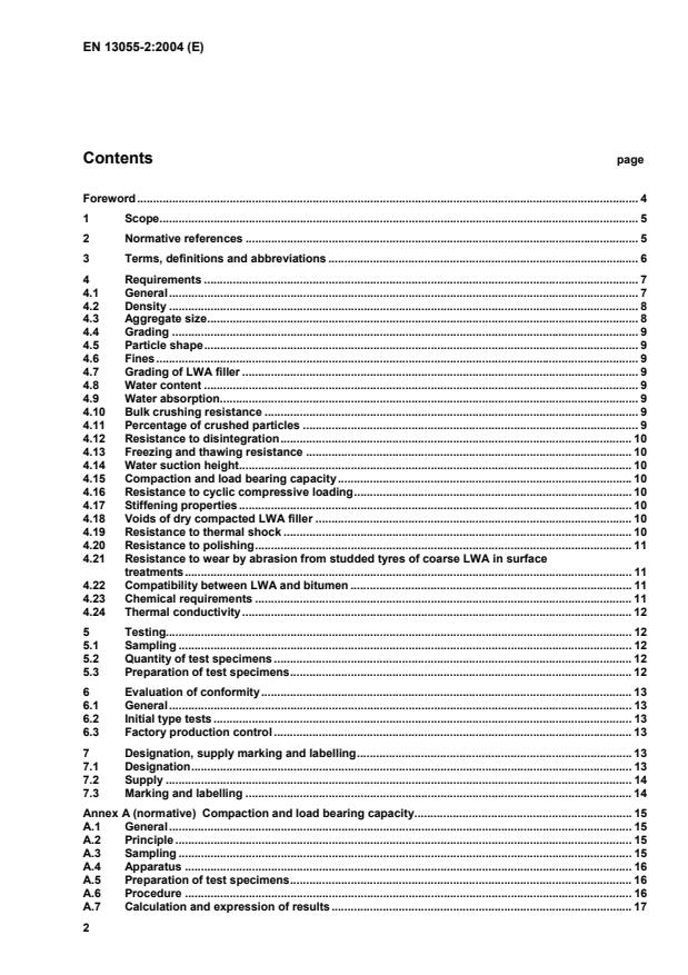 EN 13055-2:2004 is a standard published by the European Committee for Standardization (CEN). Its full title is "Lightweight aggregates - Part 2: Lightweight aggregates for bituminous mixtures and surface treatments and for unbound and bound applications". This standard covers: This European Standard specifies the properties of lightweight aggregates and fillers derived thereof obtained by processing natural, manufactured or recycled materials and mixtures of these aggregates for bituminous mixtures and surface treatments and for unbound and hydraulically bound applications other than concrete, mortar and grout. This European Standard covers lightweight aggregates of mineral origin having particle densities not exceeding 2000 kg/m3 (2,00 Mg/m3) or loose bulk densities not exceeding 1200 kg/m3 (1,20 Mg/m3) including: a) natural aggregates; b) aggregates manufactured from natural materials and/or from by-products of industrial processes; c) by-products of industrial processes; d) recycled aggregates. It provides for the evaluation of conformity of the products to this European Standard. The requirements specified in this standard may not be relevant to all types of lightweight aggregates. For particular applications the requirements and tolerances can be adapted for the end use. NOTE Aggregates used in construction should comply with all the requirements of this European Standard. As well as familiar and traditional natural and manufactured aggregates Mandate M/125 "Aggregates" included recycled aggregates and some materials from new or unfamiliar sources. Recycled aggregates are included in the standards and new test methods for them are at an advanced stage of preparation. For unfamiliar materials from secondary sources, however, the work on standardization has only started recently and more time is needed to define clearly the origins and characteristics of these materials. In the meantime such unfamiliar materials when placed on the market as aggregates should comply fully with this standard and national regulations for dangerous substances (see annex ZA) depending upon their intended use. Additional characteristics and requirements can be specified on a case by case basis depending upon experience of use of the product, and defi