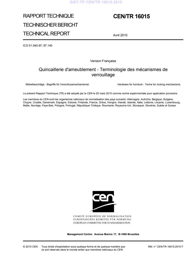 CEN/TR 16015:2010 is a technical report published by the European Committee for Standardization (CEN). Its full title is "Hardware for furniture - Terms for locking mechanisms". This standard covers: This Technical Report specifies terms for all types of locking mechanisms for all fields of application. With the aid of figures it establishes different types, with the aim of facilitating comprehension of the technical language.