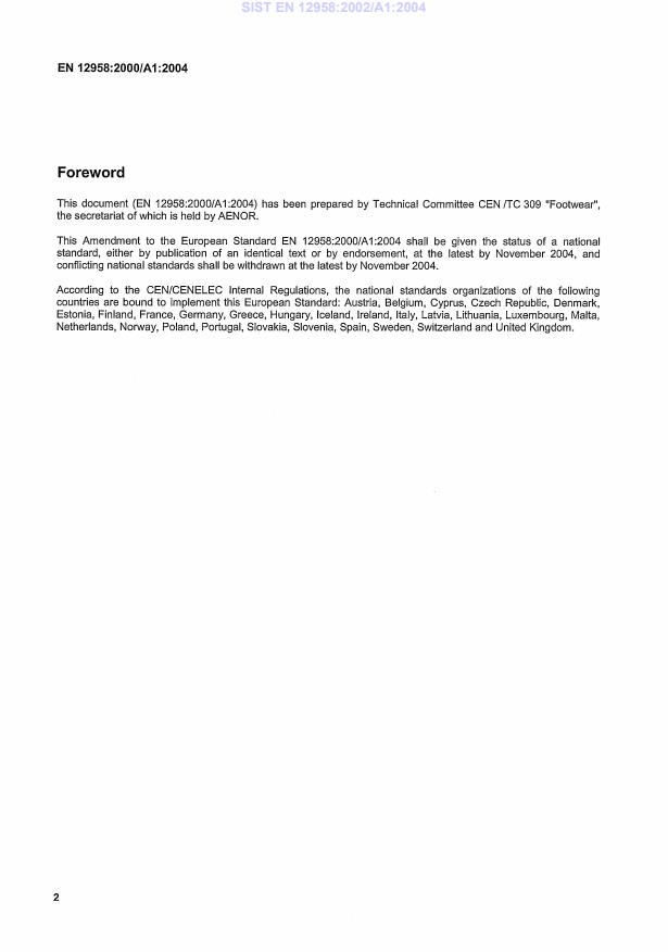 EN 12958:2000/A1:2004 is a amendment published by the European Committee for Standardization (CEN). Its full title is "Footwear - Test methods for shanks - Fatigue resistance". This standard covers: This European Standard specifies a test method for assessing the fatigue resistance of steel shanks of at least 100 mm in length used for the reinforcement of the waist region of women's shoes and of some men's and children's shoes. NOTE Steel shanks below 100 mm in length cannot be reliably tested by this method.