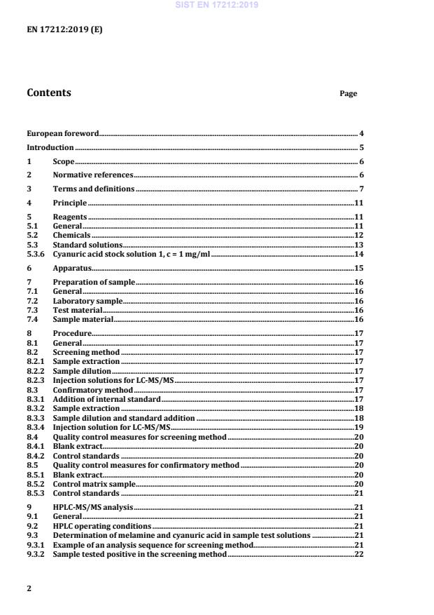 EN 17212:2019 is a standard published by the European Committee for Standardization (CEN). Its full title is "Animal Feeding stuffs - Methods of sampling and analysis - Determination of melamine and cyanuric acid content by liquid chromatographic method with mass spectrometric detection (LC-MS/MS)". This standard covers: This document specifies a high-performance liquid chromatographic (HPLC) mass spectrometric (MS) method for screening and quantification of melamine and cyanuric acid in the concentration range between 1 mg/kg and 100 mg/kg feed. The method is validated in an international collaborative trial for melamine in complete feed, complementary feed, feed material, milk replacer and pet food including canned pet food in the range between 1 mg/kg and 80 mg/kg with particular regard to the maximum level of 2,5 mg/kg as established by the European Commission. Laboratory experiences have shown that the method is also applicable for cyanuric acid in the same concentration range in complete feed (n = 7), complementary feed (n = 6), feed material (n = 7, resp. 9), milk replacer (n = 7) and pet food (n = 7) including canned pet food. Since the LC-MS/MS sensitivity for cyanuric acid is lower than for melamine, it has to be ensured that the LC-MS/MS system is in excellent working order. The method is applicable to feeding stuffs but not tested for pre-mixtures and feed additives. Quantification of concentrations above 100 mg/kg is possible, but the method has to be validated by the operator.