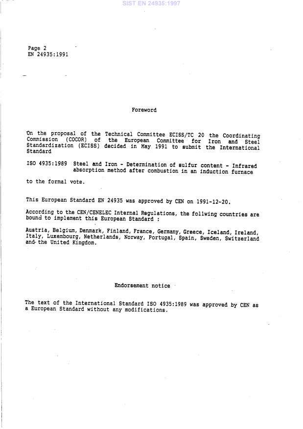 Keywords: EN 24935:1991, ISO 4935:1989, sulphur determination, sulfur analysis, infrared absorption, induction furnace, sulphur content in steel and iron, calibration, precision.