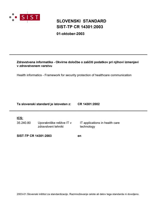 CR 14301:2002 is classified under the following ICS (International Classification for Standards) categories: 35.240.80 - IT applications in health care technology. The ICS classification helps identify the subject area and facilitates finding related standards.