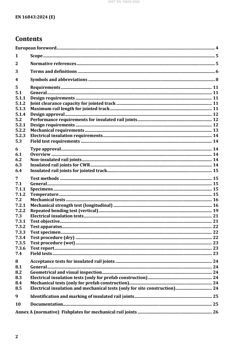 EN 16843:2024 is a standard published by the European Committee for Standardization (CEN). Its full title is "Railway applications - Infrastructure - Mechanical requirements for joints in running rails". This standard covers: This European Standard deals with mechanical rail joints for flat bottom rails 46 kg/m and over. The scope of this standard is: to establish requirements for insulated and non-insulated rail joints, for stressed rail (continuous welded rail, CWR) and unstressed rail (jointed track); to define mechanical and electrical requirements for type approval and for acceptance of insulated rail joints which are manufactured in a factory (prefab construction) as well as assembled onsite (site construction). This standard specifies the minimum requirements. Special applications as for instance tram systems may require different demands in certain paragraphs and should be agreed between customer and supplier. The scope also excludes expansion joints (it is covered in EN 13232-8), and special joints in switch constructions.