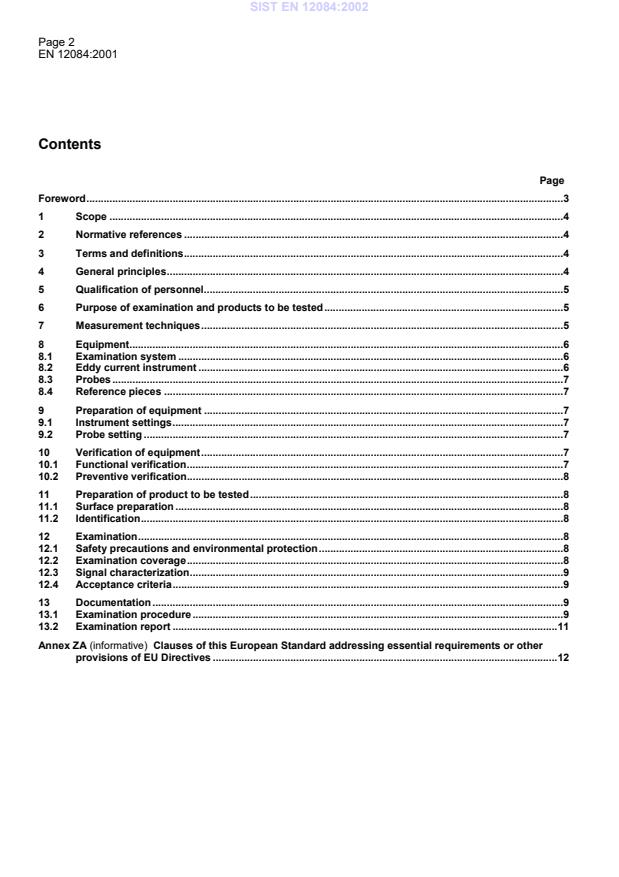Page 2EN 12084:2001ContentsPageForeword.31Scope.42Normative references.43Terms and definitions.44General principles.45Qualification of personnel.56Purpose of examination and products to be tested.57Measurement techniques.58Equipment.68.1Examination system.68.2Eddy current instrument.68.3Probes.78.4Reference pieces.79Preparation of equipment.79.1Instrument settings.79.2Probe setting.710Verification of equipment.710.1Functional verification.710.2Preventive verification.811Preparation of product to be tested.811.1Surface preparation.811.2Identification.812Examination.812.1Safety precautions and environmental protection.812.2Examination coverage.812.3Signal characterization.912.4Acceptance criteria.913Documentation.913.1Examination procedure.913.2Examination report.11Annex ZA (informative)